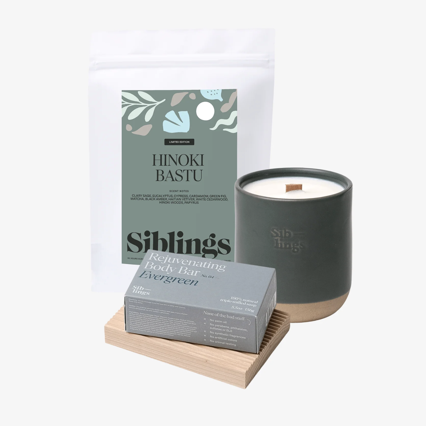 A full ritual for calm, inspired by the Swedish sauna. The Hinoki Bastu Clean Candle fills the space with fresh eucalyptus, green fig, and smoky hinoki woods—woody, herbal, and deeply grounding. Paired with the rejuvenating body bar, it cleanses and restores both skin and spirit. A quiet reminder that renewal can be as simple as light, breath, and stillness.
